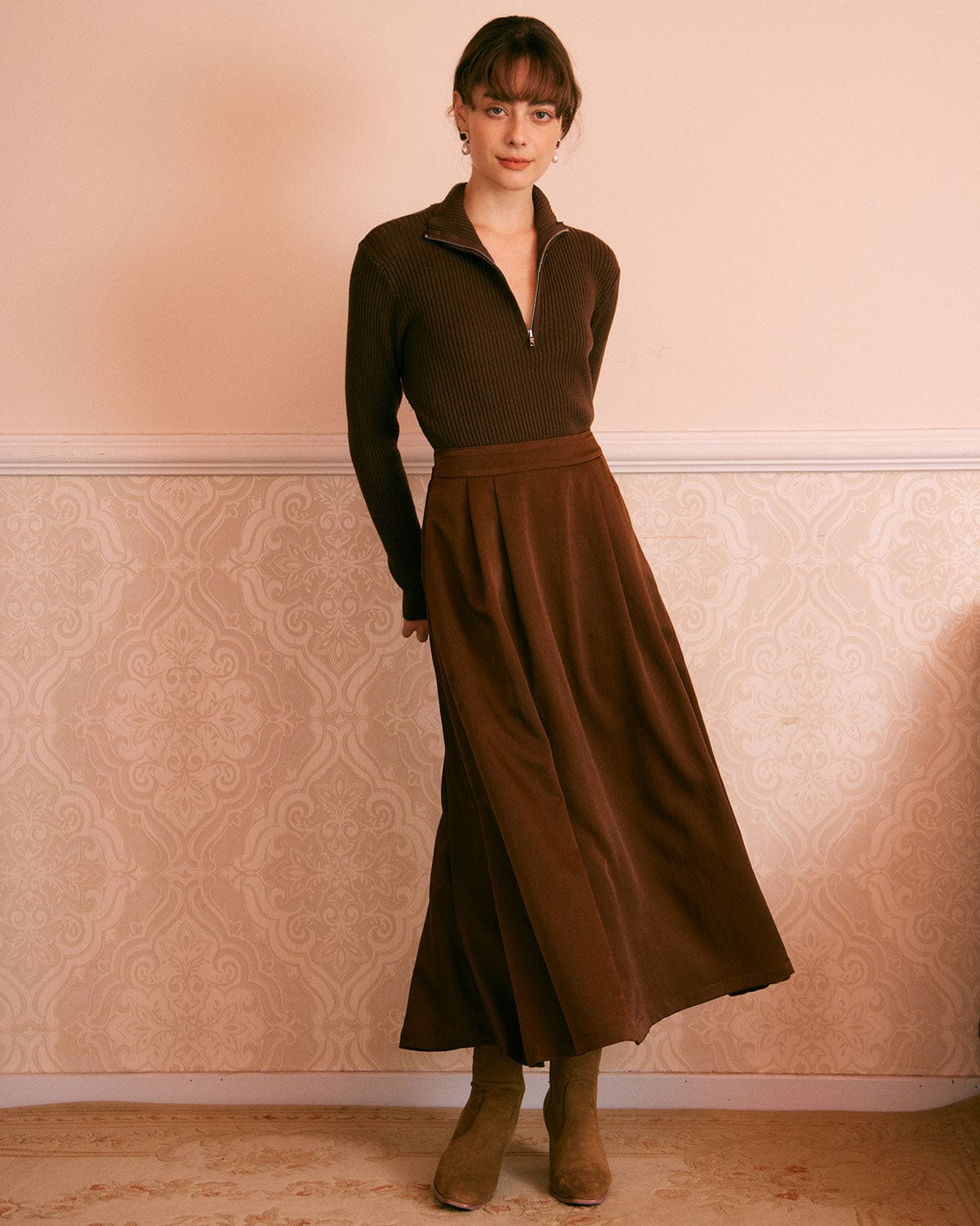 The Brown Single Breasted Suede Midi Skirt